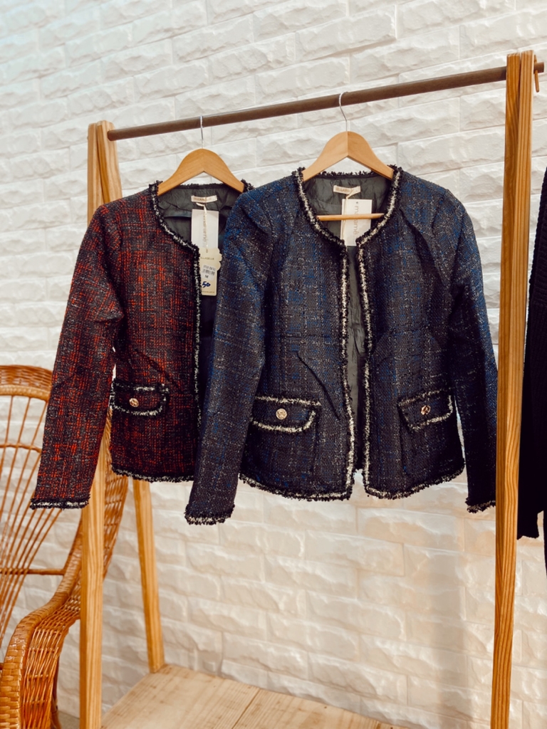 Casaco no tecido Tweed todo forrado por dentro, detalhes em brilhos, bolso falto com botão prata, colchete para abotoar na frente.