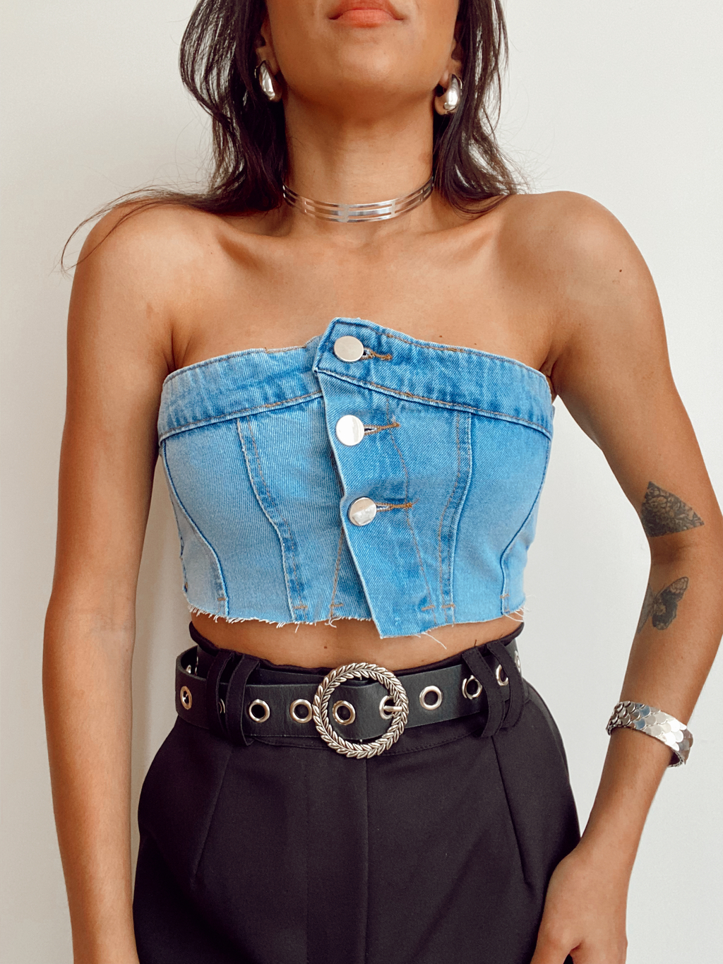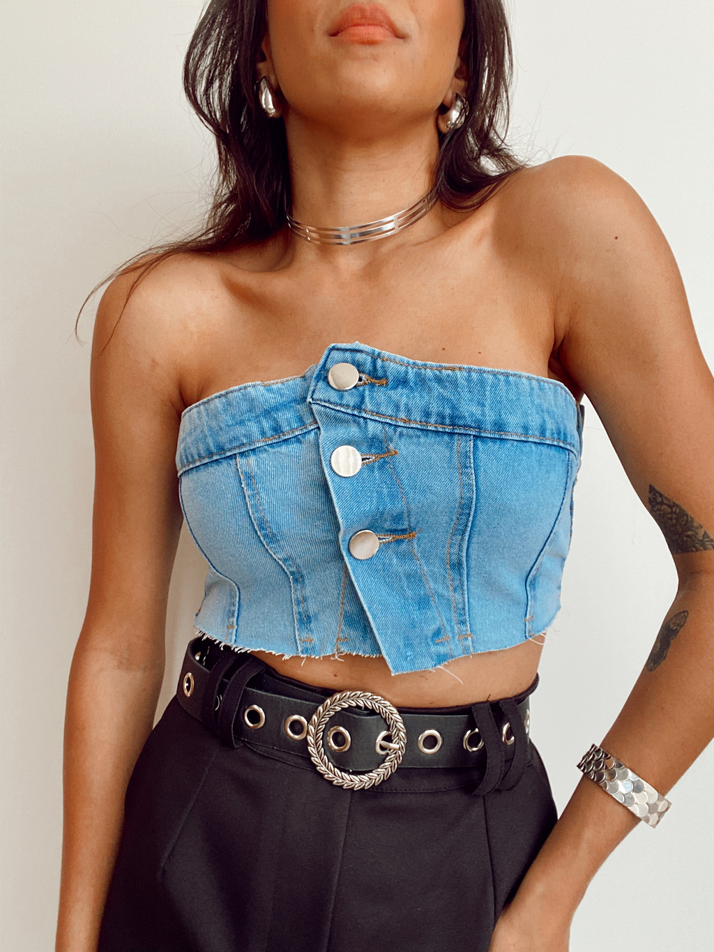 Nosso Cropped Paola todo no jeans, com aviamentos metalizados e elásticos atrás, perfeito pra quem ama peças estilosas e de qualidade!