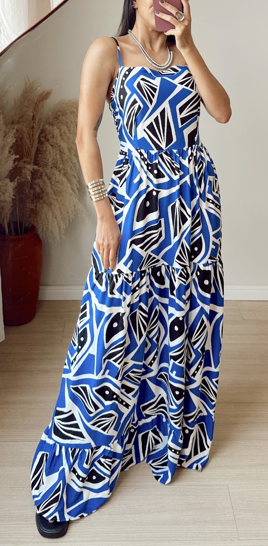 Aquele vestido incrível com uma padronagem diferenciada e rica. Possui a modelagem ampla no comprimento da saia, e cintura marcada. Elástico nas costas e bojo para sustento do busto, além das alças com reguladores. Confeccionado na melhor viscose do mercado, a Sarjada. Com certeza será o vestido favorito da próxima estação.